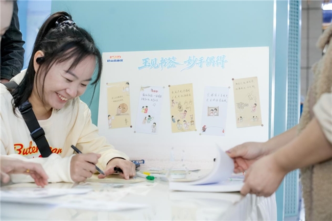 最热闹的要数昆曲书签手作体验区。大家低头认真描画,将心仪的曲词一笔一画留在精美的卡纸上。完成的作品被展示在特制的“玉见书签 妙手偶得”背景板上,为这个科技感十足的空间开辟了一个专属的文艺角落。一位年轻女孩一边仔细地粘贴昆曲贴纸,一边感慨:“我看过《玉见梁辰鱼》!没想到在赶火车的间隙,还能静下心来抄一句曲词,体验“玉见梁辰鱼”同款风采!”