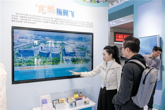 展厅入口的LED大屏上正循环播放着《玉见高新》昆山高新区宣传片,将昆山高新区的自然风光、现代产业与未来愿景巧妙融合,让旅客在踏入展厅的第一时间就能感受到这片土地的创新血脉与人文精神。