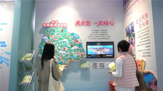 文旅展示区以“来太仓,一见倾心”为主题。墙面上的全域旅游互动地图集中呈现了阿尔卑斯国际度假区、罗腾堡风情街、沙溪古镇、长江林场探险公园等特色文旅地标。轻拍按钮,便能解锁对应景点的介绍视频,让旅客更直观地感受太仓宜居宜业、宜游宜创的幸福图景。