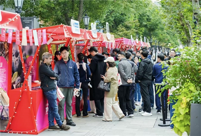 上海,2025年10月26日。 本周末,上海新天地街区被四十余个智利展位点亮,来自南美的水果、肉类、海鲜、葡萄酒及皮斯科酒等产品吸引了众多市民与游客驻足品鉴,为第十届智利周的闭幕活动增添了浓浓的节日气氛。
