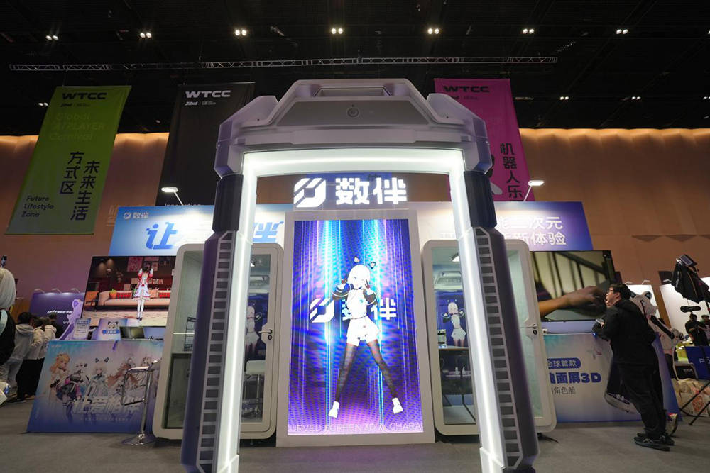 数伴展位以“AI·次元交互体验”为主题,打造了兼具科技感与趣味性的沉浸互动空间。两位人气Coser分别饰演看板娘“姵儿”和“初音未来”,在现场与观众亲密互动,吸引大家参与体验环节与抽奖活动。现场氛围热烈,观众拍照打卡上传至社交媒体,相关话题热度持续攀升,成为WTCC期间备受年轻人关注的展位之一。