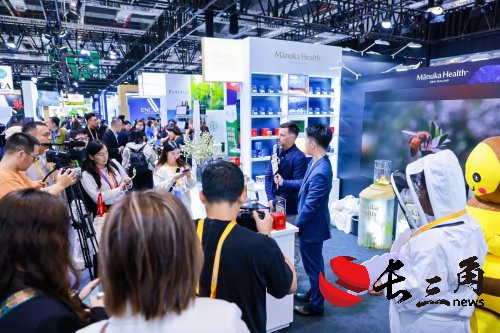进博会期间,蜜纽康展台迎来了新西兰官方的重磅到访。新西兰贸易和投资部部长托德·麦克莱(Hon Todd McClay)与新西兰驻华大使乔文博(Jonathan Austin)先后莅临,并与蜜纽康亚太区总经理Simon McLennan共同品鉴了新品巅峰麦卢卡蜂蜜 MGO 1600+。部长的到访充分体现了对新西兰本土领军品牌及其创新成果的肯定。大使在致辞中表示,蜜纽康作为新西兰的代表品牌,以科学严谨的精神让麦卢卡蜂蜜的天然力量得到更广泛的认知,展现了新西兰健康产业的创新活力。展台现场人气高涨,吸引了来自媒体、行业专家与观众的热烈关注。