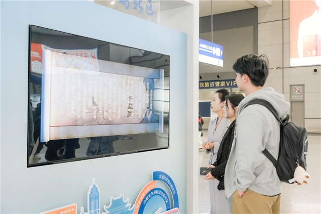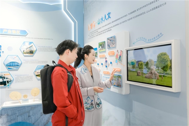 在展厅内的“览古今·山水人文”展墙前,有好奇的旅客伸手点击墙上的“文旅线路”互动按钮,右侧的屏幕立刻“活”了起来:8大景点随心切换,图文视频轮番登场——蚕里街区的烟火气、大阳山的森呼吸、塘小丫的研学趣……让人恨不得立刻直奔浒墅关!
