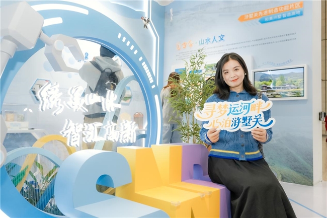 展厅入口的LED大屏上正循环播放着浒墅关的“颜值大片”,向来往旅客展示着这座城市的独特魅力。运河潺潺,青山隐隐,现代产业园与古镇风光交相辉映,瞬间将围观的旅客带入“和美浒墅关、乐享山水田”的如画景致中去。